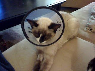 So, we go to this cat rescue thing a few days later, and within 2 minutes Jake spots an adorable SPAZ kitty, named Charlie. He’s so cute and a little bit cross-eyed I concur that we need him. So, we tell the people we want him and they respond by telling us we can’t adopt a kitty under 6 months without adopting another cat. So, we then proceed to look for another cat. We come across Emily, a beautiful Siamese looking kitty with blue eyes. We are just about to leave with them when they are doing a last minute check on the kitties. Well, apparently Emily had been spay last week and her stupid foster mom hadn’t kept the cone on her, and now her wound was infected. So, as we are leaving they mentioned (post-adoption of course) that we need to go right to the vet, and the vet is super mad that they let us adopt her like that. The vet takes the stiches out, gives us some meds, a cone (e-collar) and sends us on our way. I FORGOT TO MENTION in this whole mix, that Jake was supposed to leave for work to San Francisco like an hour after we leave the vet. Of course he wants to adopt and then leave me with all the work. Luckily, the trip gets postponed til the morning. So, we go back home are getting settled, it’s a crazy day, the end. Right???