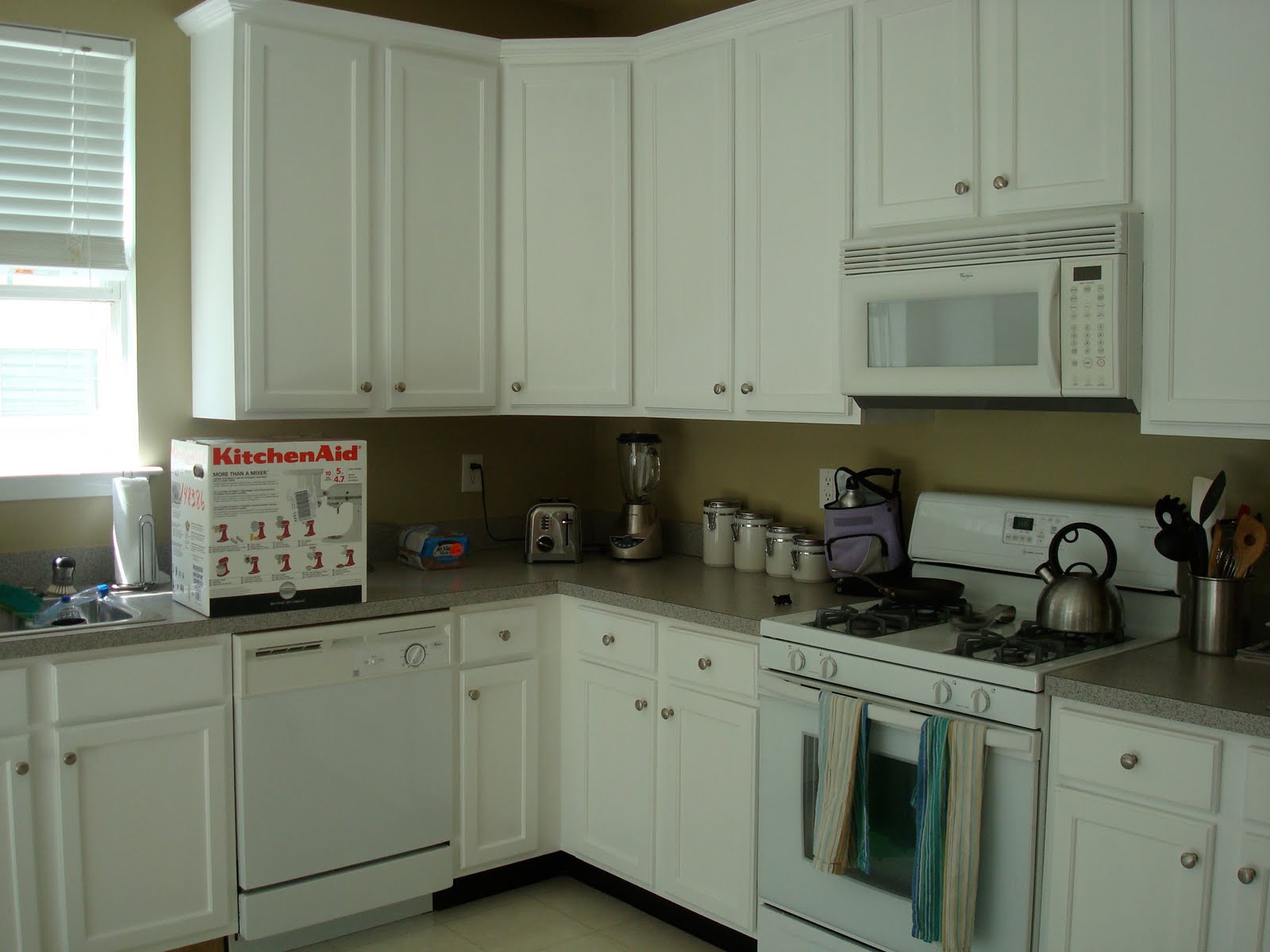 Came via Just-a-Girl. I love your cabinets. I recently painted a vanity in our hall bathroom, and it was my first experience painting a cabinet. Hats off to you for doing your entire kitchen. My little cabinet about killed me.