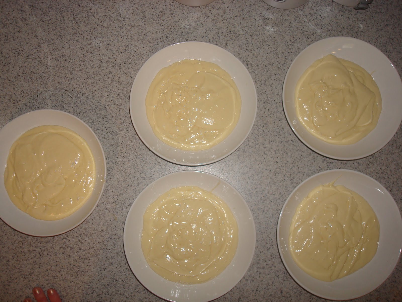 This is all 5 layers stacked. I cooked each layer. They cooked fairly similarly since it was the exact same amount, but I still cut the tops off with a serrated knife for a more even look. I then put a little icing between each layer, and then began my crumb coat next.