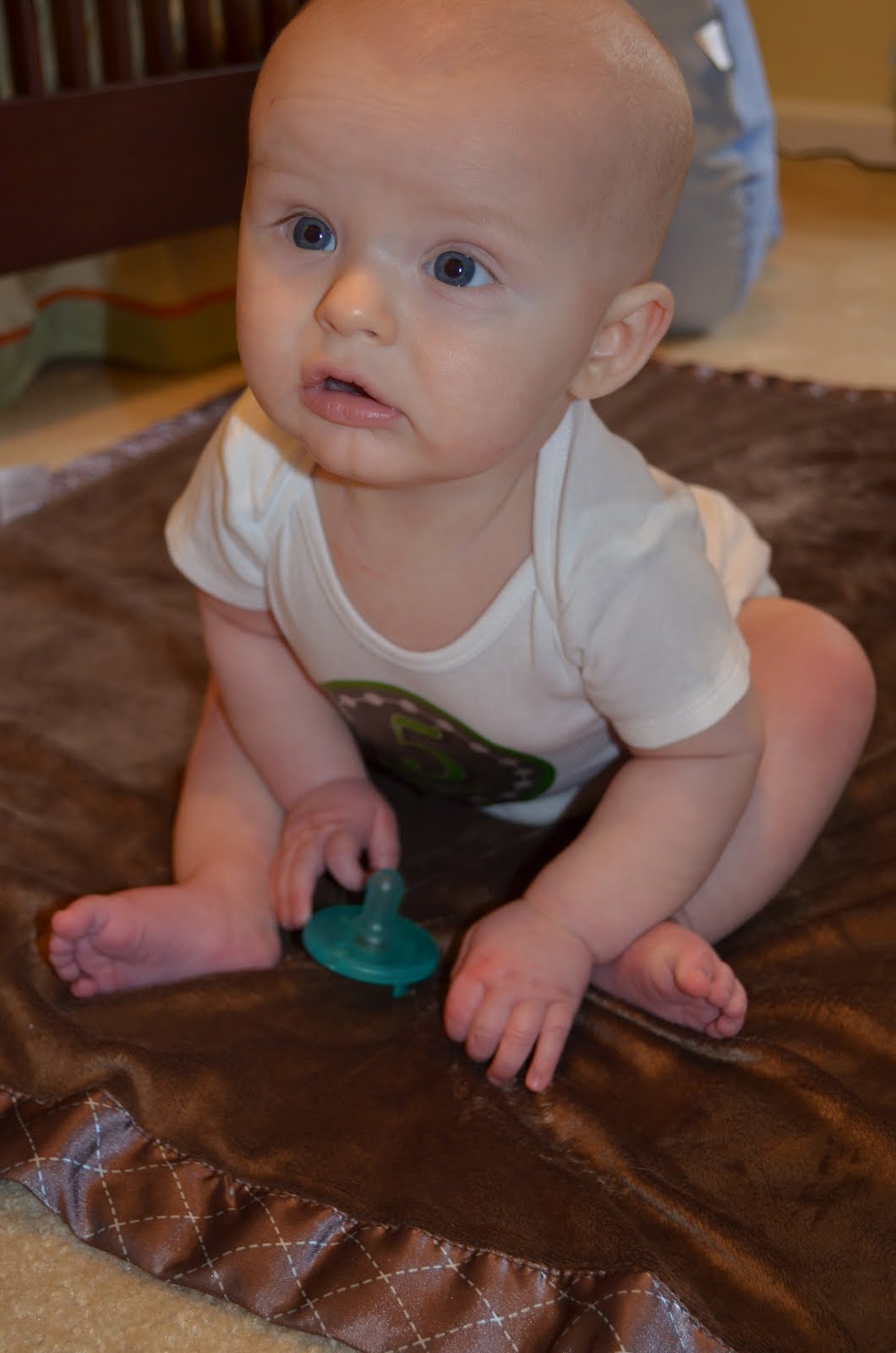 -You have rolled back to front on occasion, but not very often. The other day dad said, he’s never going to learn it, and as if on command 5 seconds later you rolled back to front right in front of him. (Showed him, ha)! Even though you don’t get all the way over, you’ve mastered this rolling back and forth thing without turning all the way over to scoot around, it’s kind of funny.